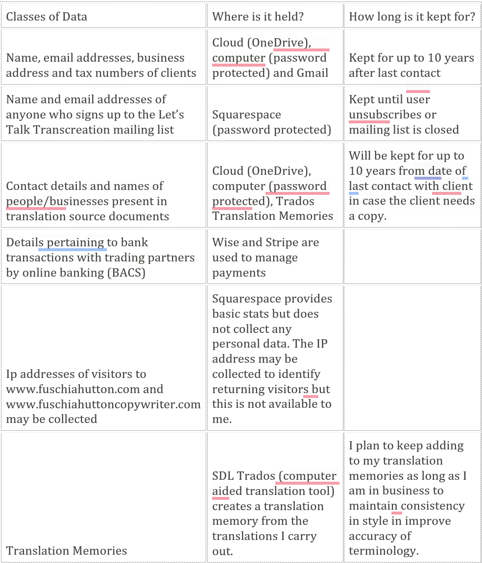I collect, store and process names, email addresses, business addresses and tax numbers of my clients for communication and invoicing purposes. I also collect names and email addresses of colleagues who voluntarily sign up for my Let’s Talk Transcreation online networking session. Emails are used to let my colleagues know about the sessions so they can sign up - I do not use this email newsletter for marketing purposes.